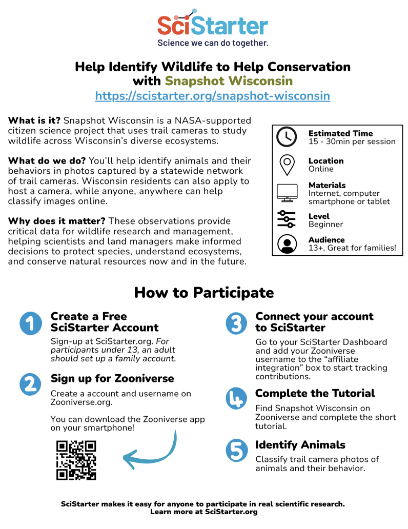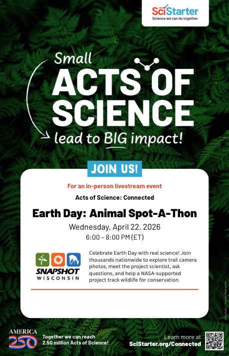 This is a signature event of Citizen Science Month 2026, and all activity counts towards a collective goal of 2.50 Million Acts of Science before the end of April. Report your Acts of Science, which includes event attendance and estimated Snapshot Wisconsin classifications, to CitizenScienceMonth.org!