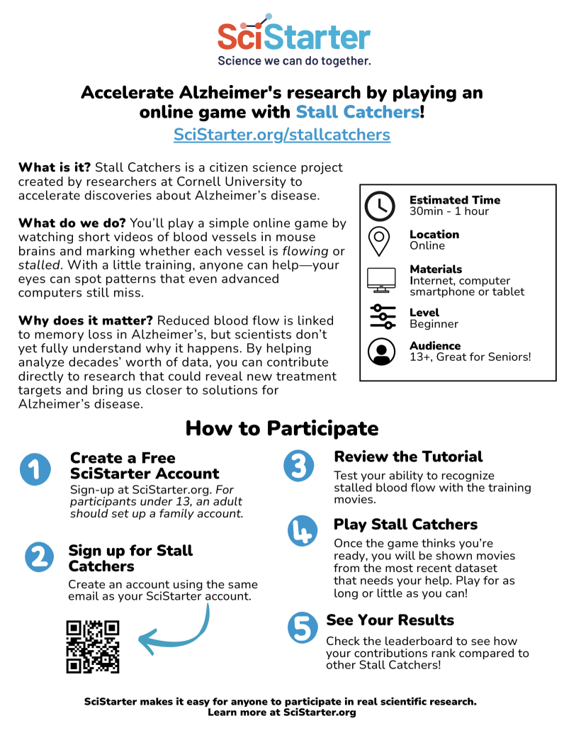 Thank you for facilitating this event and supporting the citizen science project Stall Catchers. With your help, scientists get closer to finding treatments for Alzheimer’s Disease.