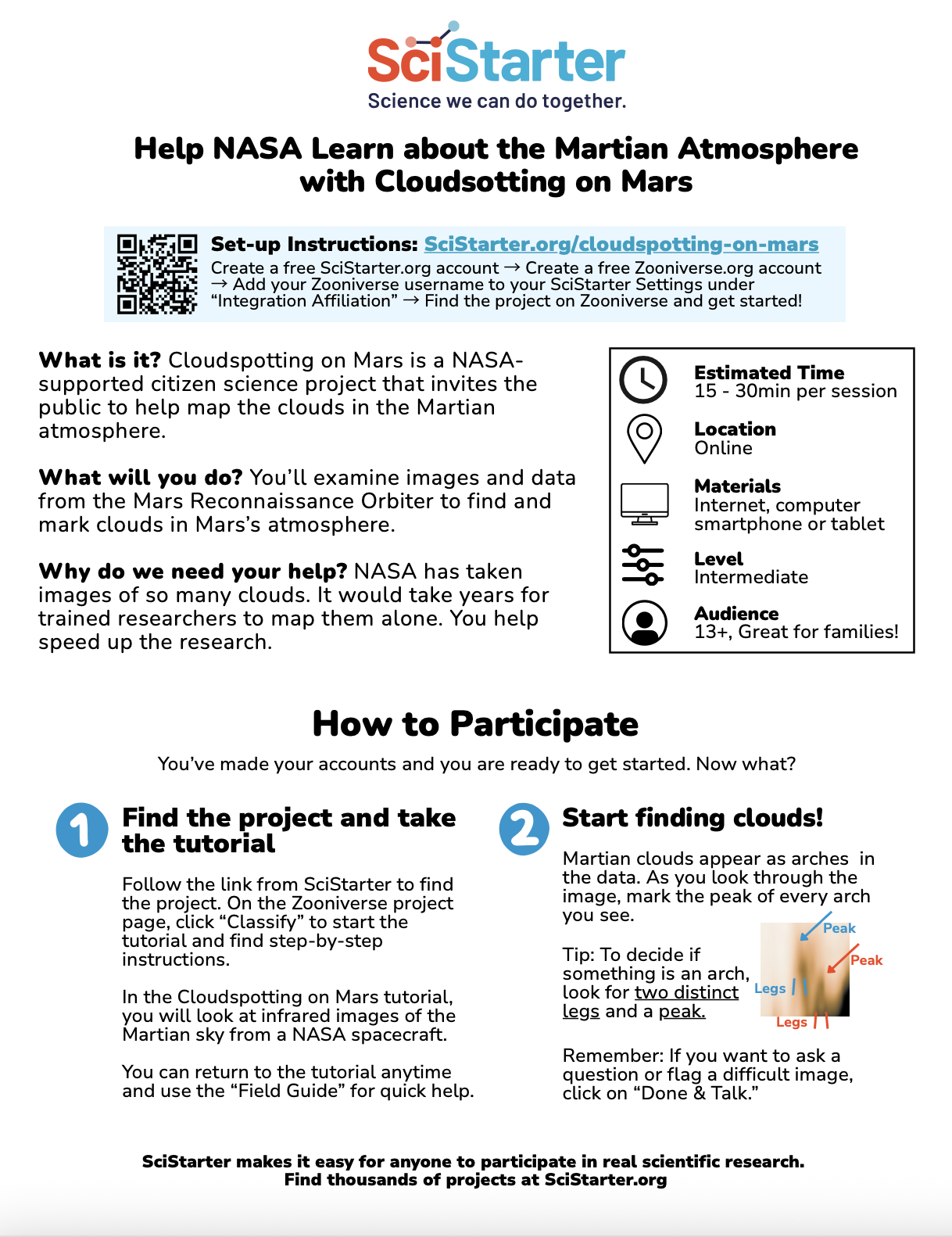 This is a signature event of Citizen Science Month 2026, and all activity counts towards a collective goal of 2.50 Million Acts of Science before the end of April. Report your Acts of Science, which includes event attendance and estimated Cloudspotting on Mars classifications, to CitizenScienceMonth.org!