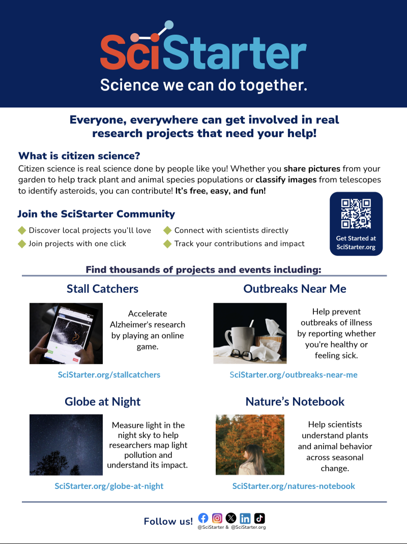 Promotes participation in citizen science and introduces six featured projects on SciStarter.